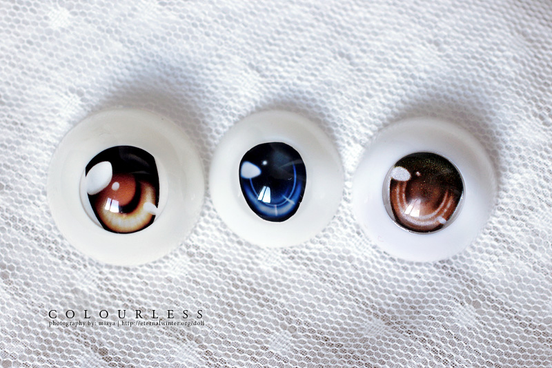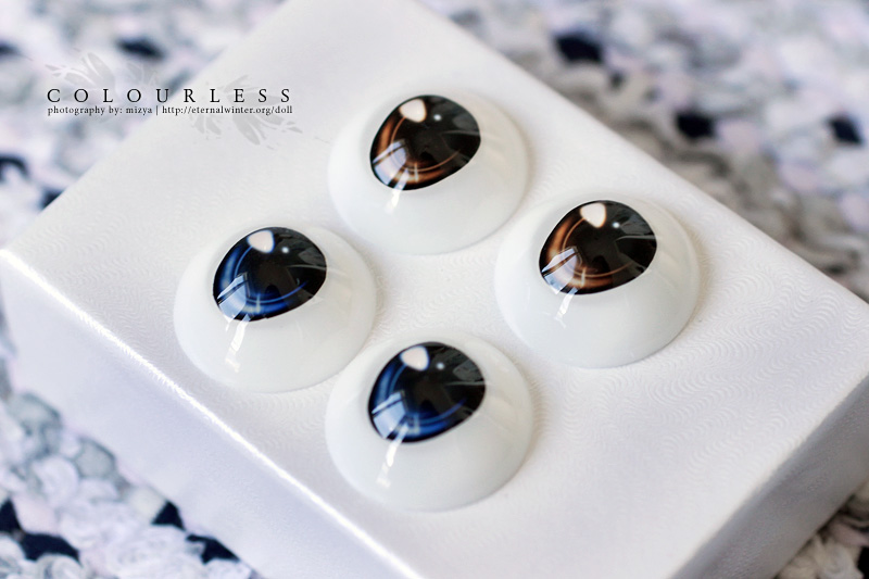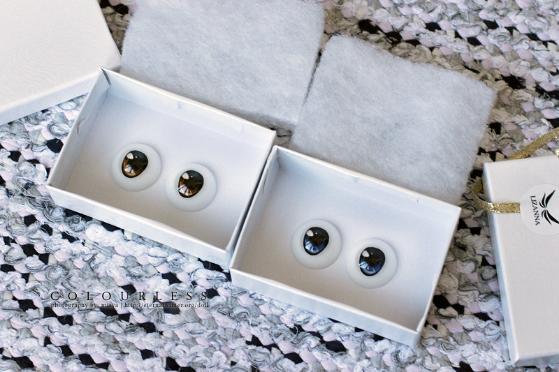 The very first eyes that I bought were from SQ Lab, they were advertised as urethanes, but to me it seemed like they still had an acrylic dome. They were quite nice, but a bit small for my DDH-06 girls in 22mm size — I use 24mm eyes from Volks for them. After that I bought White Dolly Story eyes, although they were acrylic they seemed quite pretty. But those were a huge disappointment for me, they look so pixelated and dull. ( ̄□ ̄) Even Volks’ acrylics are better quality and they’re cheaper. I also had to pay EMS postage for the WDS eyes, so I wasn’t a happy panda. (ーー;) I was somewhat discouraged to try any eyes after that… But the Lizanna eyes seemed so sparkly and pretty, that I eventually decided to order two pairs. Although, I feared that they also might be a bit small, as they’re only available in 22mm.
